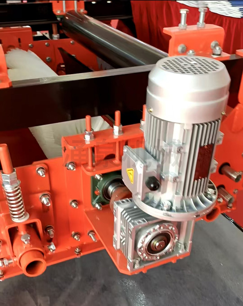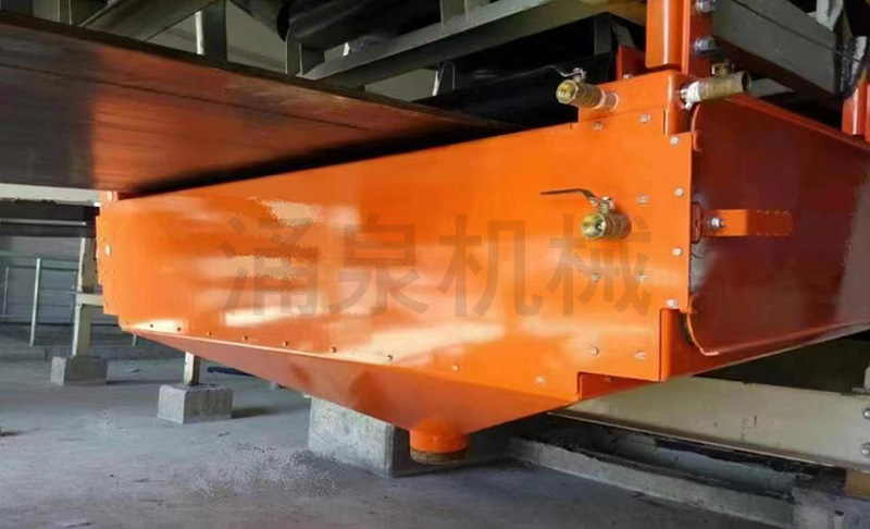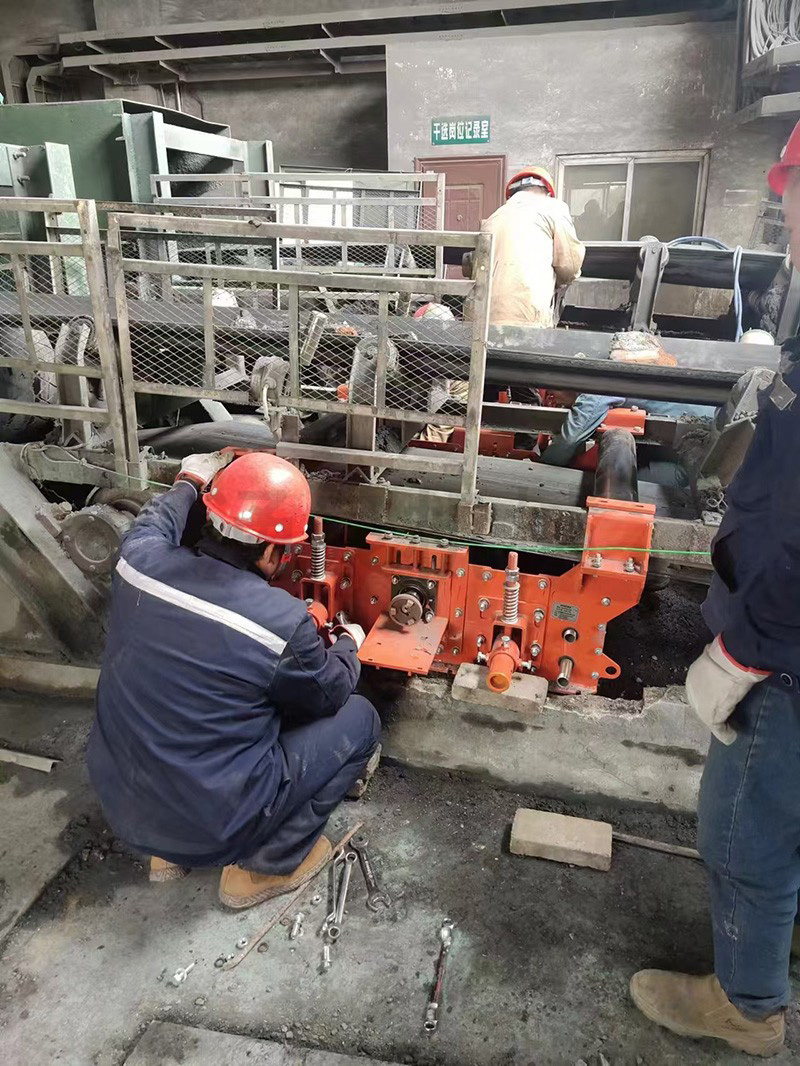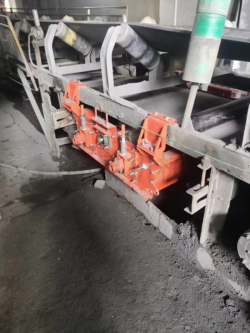 回程輸送帶從水刀進(jìn)入,噴水管可以對回程輸送帶下表面上的殘留物料進(jìn)行噴淋,使干燥的物料軟化,第一道清掃器刮刀緊貼回程輸送帶下表面,刮除殘留物料,最后第二道清掃器刮刀則將第一道清掃器遺漏的少許殘渣等刮除干凈,第三道為除水清掃器,刮除回程皮帶下表面的水流,最后經(jīng)過(guò)風(fēng)刀,將回程皮帶下表面吹干。