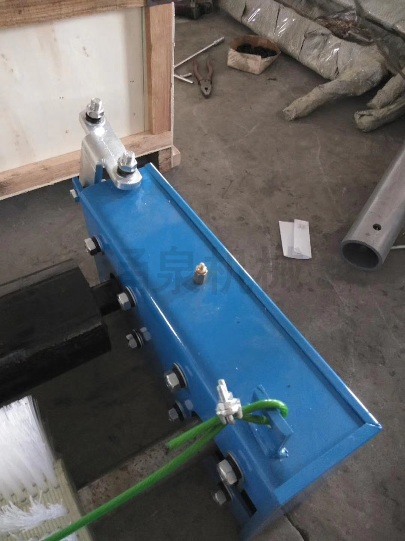 7. 根據鎖具螺旋扣及鋼絲繩的最大長(cháng)度,在機架的適當位置焊接螺旋扣拉緊桿,將鎖具螺旋扣連接在拉緊桿上,通過(guò)螺旋扣調整滾刷的位置,刷毛與皮帶的接觸深度不宜過(guò)大,否則將縮短清掃滾刷的使用壽命。