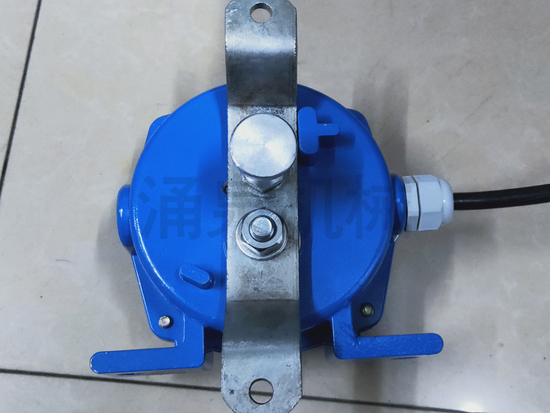 當膠帶運輸現場(chǎng)發(fā)生緊急事故時(shí),拉動(dòng)系在吊耳上的鋼絲繩,使機內的滑塊與開(kāi)關(guān)作用,發(fā)出停機信號。松開(kāi)鋼絲繩按下復位杠后方可復位