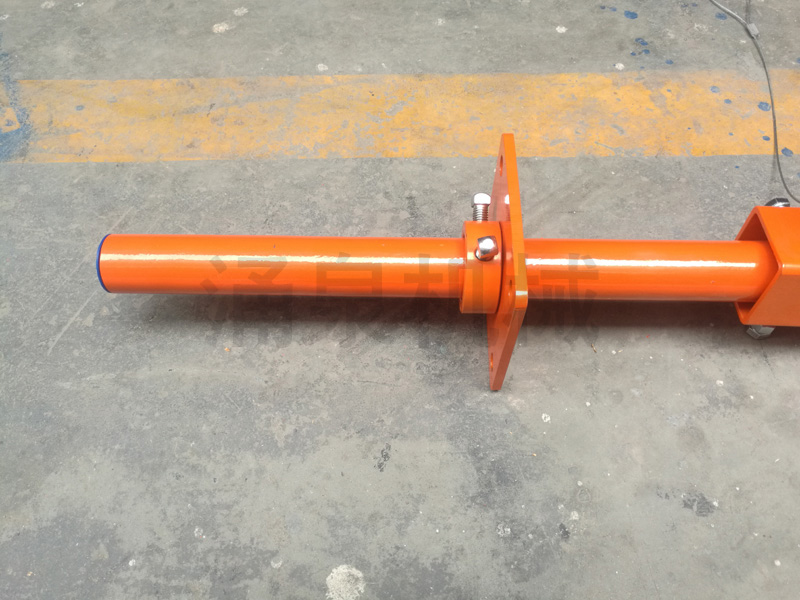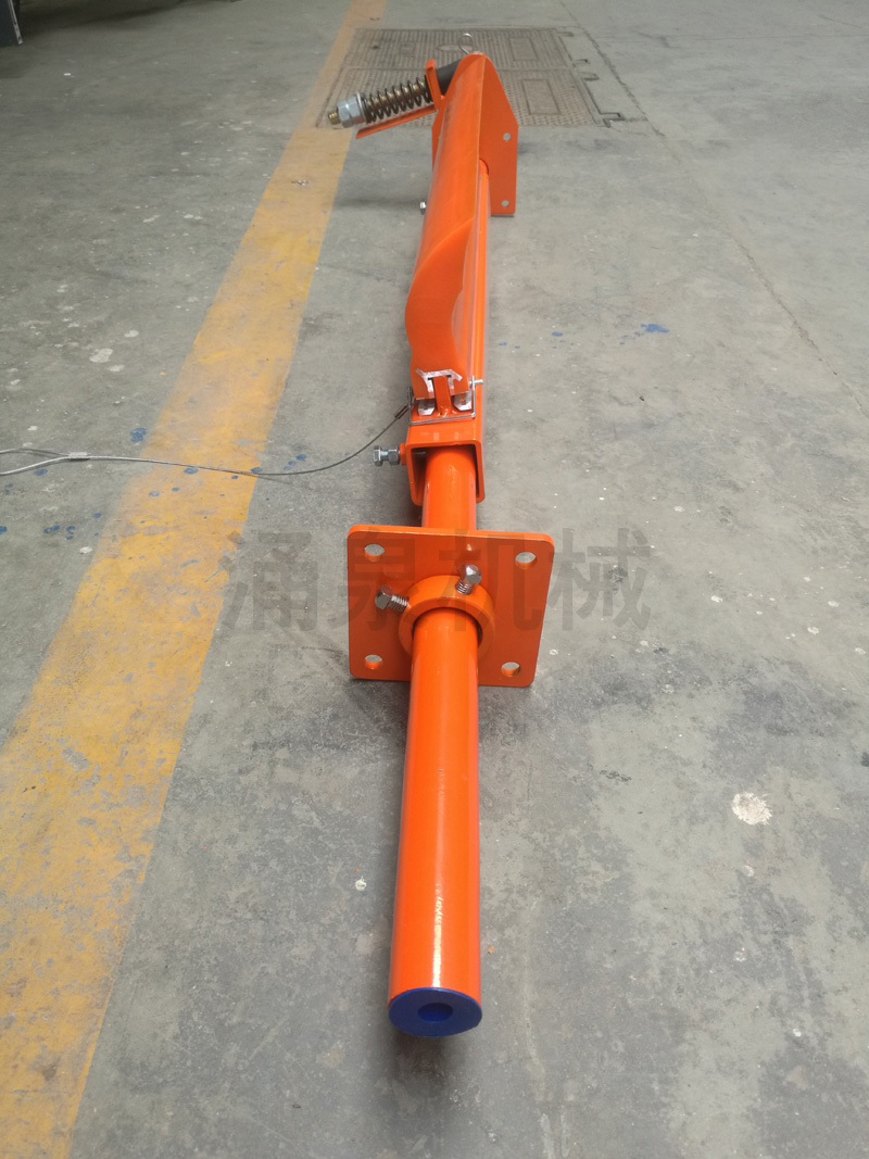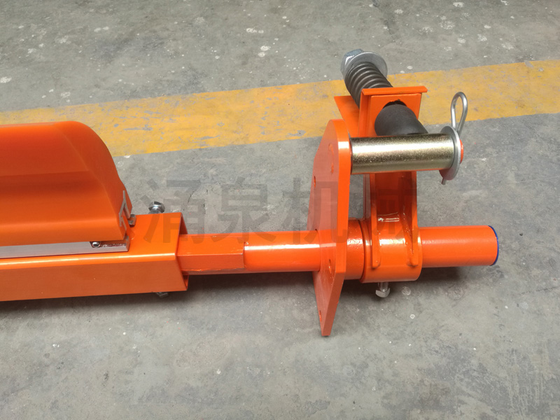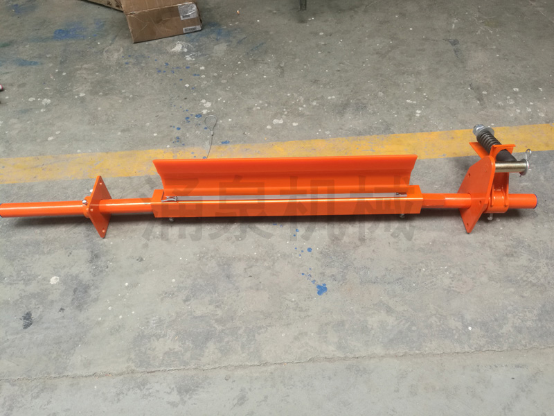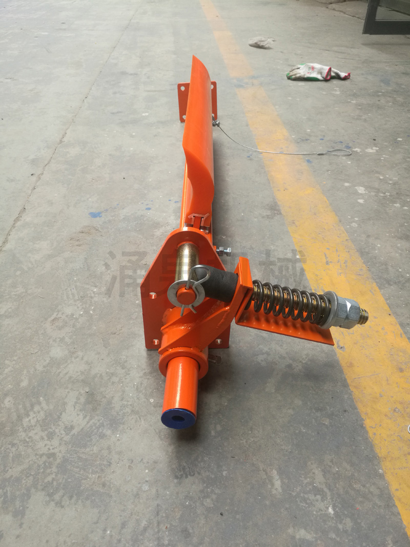 5. 安裝固定,使組裝好的清掃器軸心線(xiàn)與滾筒軸心線(xiàn)平行,刀頭緊貼帶面,然后調整使刀尖線(xiàn)的中心對準滾筒軸心線(xiàn)的中心,將橫梁底部的鎖緊螺釘擰緊并用螺母鎖定。通過(guò)調節螺母調整彈簧長(cháng)度,給刀頭施加預緊力,然后用鎖緊螺母鎖緊。